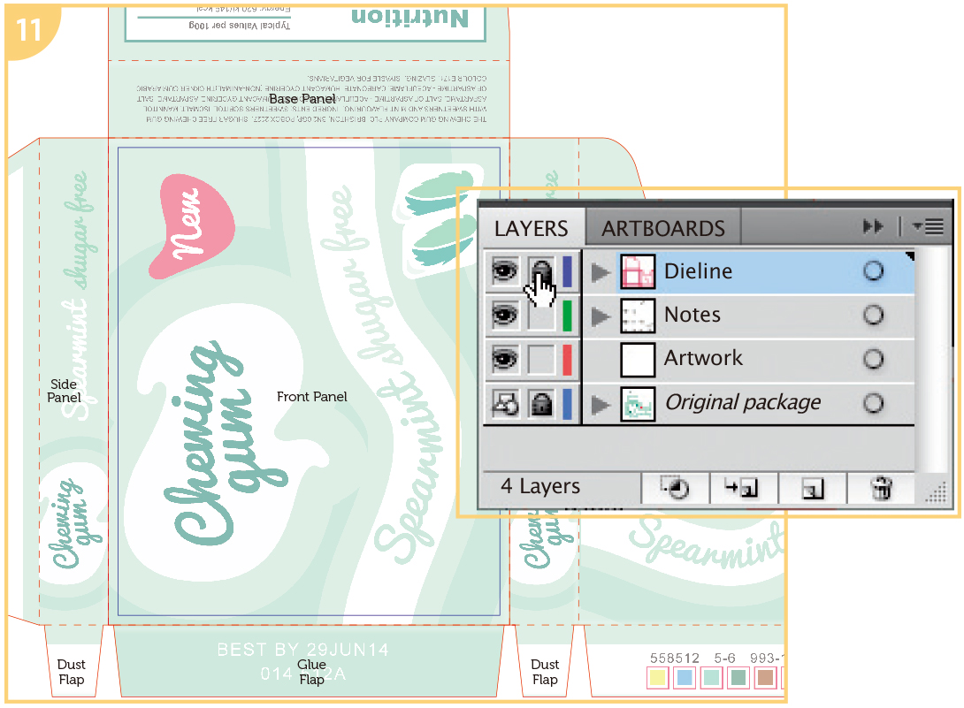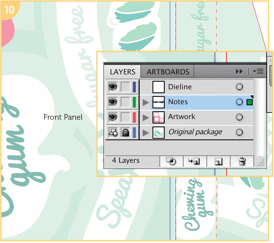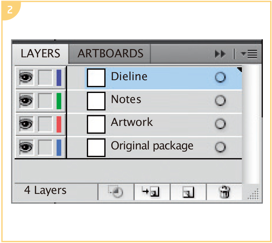 Create four layers: one titled “Dieline”, one “Artwork,” one “Original package” and one “Notes.” Your Dieline layer should be on top.