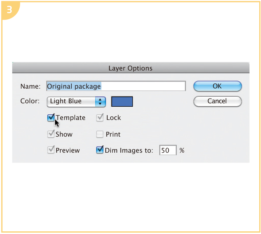 When you create the Original package layer, check the Template option. This will allow you to always see the original packaging, but as a light tint so that you can clearly see your dieline and new artwork in the foreground.